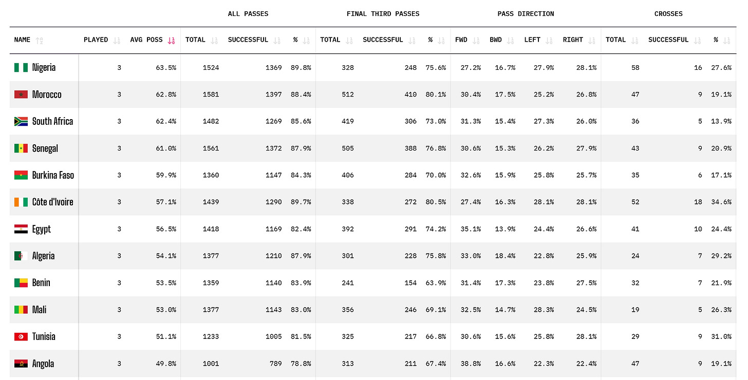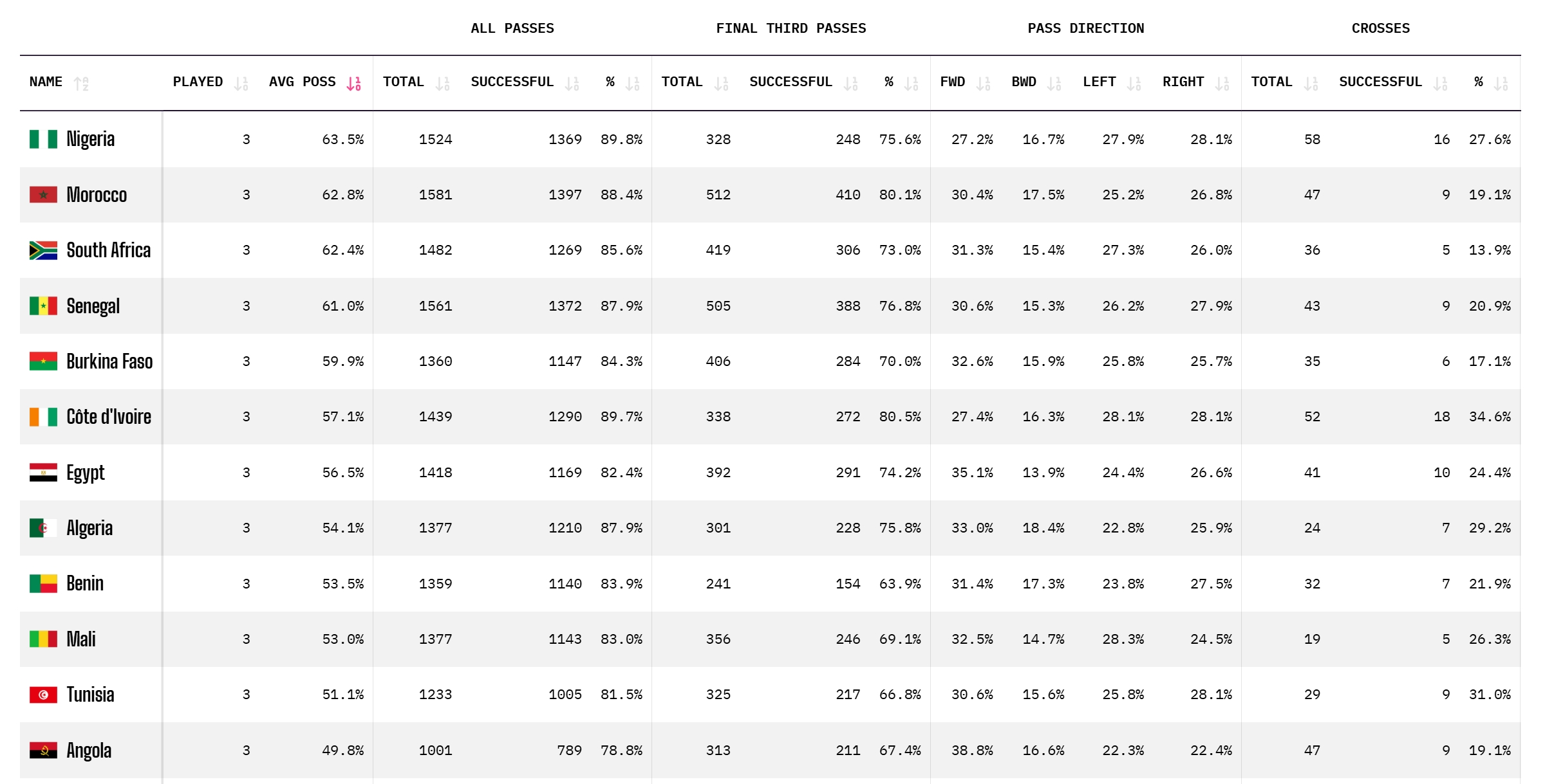 In terms of ball usage, Nigeria lead the way in average possession and sequences of 10 or more passes, and rank as the team with the lowest proportion of passes played forward, with 27.2 per cent. This is in keeping with the elite, often burdened with the imperative to dictate and carefully break down less ambitious opposition; Cote d’Ivoire and, again, Morocco and Senegal feature close by, all circulating and probing for the most part until an opening presents itself. The only significant deviations in Nigeria’s case are in terms of passes attempted into the final third where, even though the success rates are in line, there is much less volume (unsurprising considering the burden of this is inordinately shouldered by one player – Alex Iwobi. More on this later.); and in what happens when the ball goes wide, as the Super Eagles have attempted crosses more readily. The numbers paint a picture: Chelle’s side keep the ball, attack deliberately, pick their moments to penetrate, channel much of their circulation wide, and cross a lot.